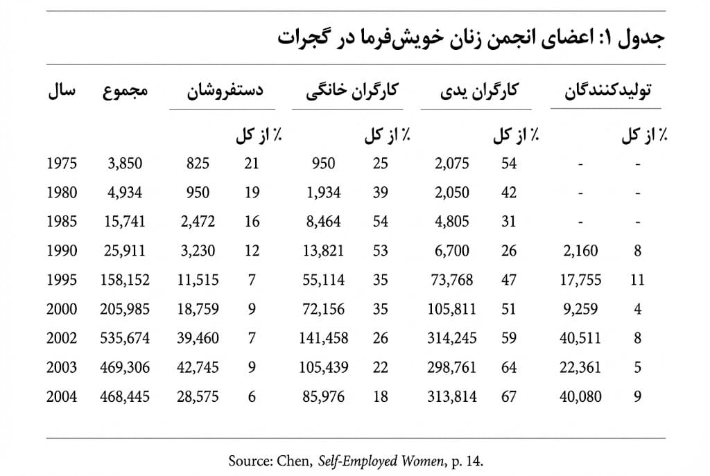 بههرحال، انجمن اصرار داشت که «پیشروی روشمند داشته باشد و پیمایش را انجام دهد و یافتههایش را به کارگران تکهدوز گزارش دهد و از آنها برای مبارزه بر سر افزایش نرخ کارمزد از سوی تاجران رولحافی و همچنین مقامات ادارهٔ کار استفاده کند. بهات میگوید پیمایشها «در گذر سالها به انجمن کمک کردند. آنها برای کسب درکی جامع از مسائل، پیش از هرگونه اقدام، مفید بودند و این فرآیند به ما کمک کرد تا رهبران بالقوه در آن اجتماعات را شناسایی کنیم».[52] این مطالعات نظرگاهی بسیار پیچیدهتر از جهان خویشفرمایی به ما دادند. تحقیقات انجمن زنان خویشفرما تا سال ۲۰۰۴ اعضایش را به بیش از ۸۰ حرفه در ۴ دستهٔ اصلی تقسیم کرده بود: دستفروشان خیابانی و دورهگردان، تولیدکنندگان خانگی، کارگران یدی و ارائهدهندگان خدمات و دست آخر، تولیدکنندگان محلی.[53] جدول ۱ رشد هر یک از این دستهها را از دههٔ ۱۹۷۰ نشان میدهد: توجه کنید که رویتپذیرترین گروه، یعنی دستفروشان خیابانی که دو درصد جمعیت شهری هند را تشکیل میدهند، بخش عمدهٔ انجمن اولیه بودند و بعداً از سهم نسبیشان کاسته شده است.
